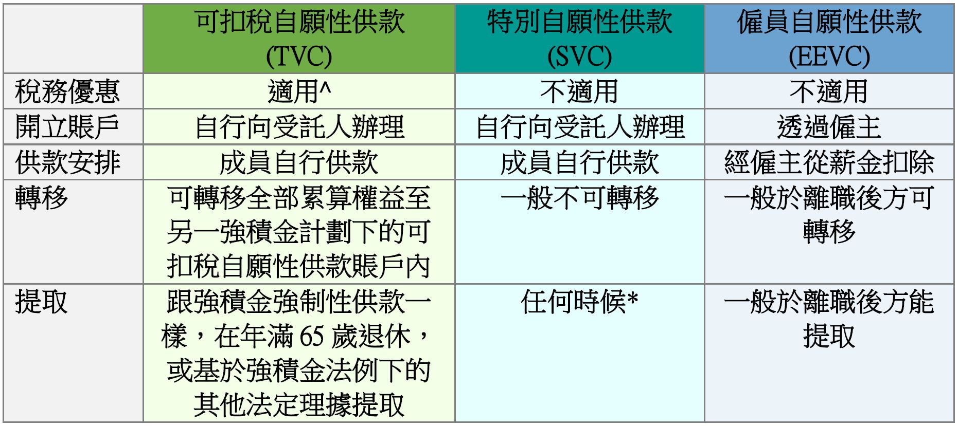MPF可扣稅自願性供款 (TVC),究竟和現有的「僱員自願性供款」及「特別自願性供款」有何不同?是否所有種類的自願性供款都可扣稅?以下表列三者的主要分別:
